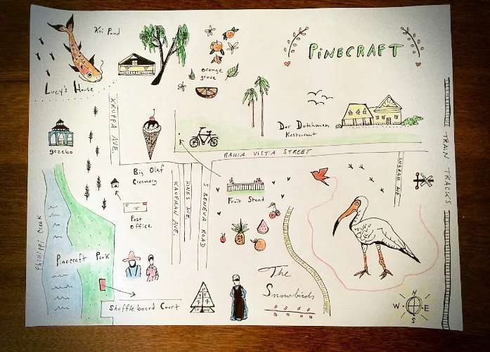 You will receive a limited edition print—a hand drawn map of Lucy's world in Pinecraft (doodled and signed by me!) as well as a SNOWBIRDS bookmark and sticker.